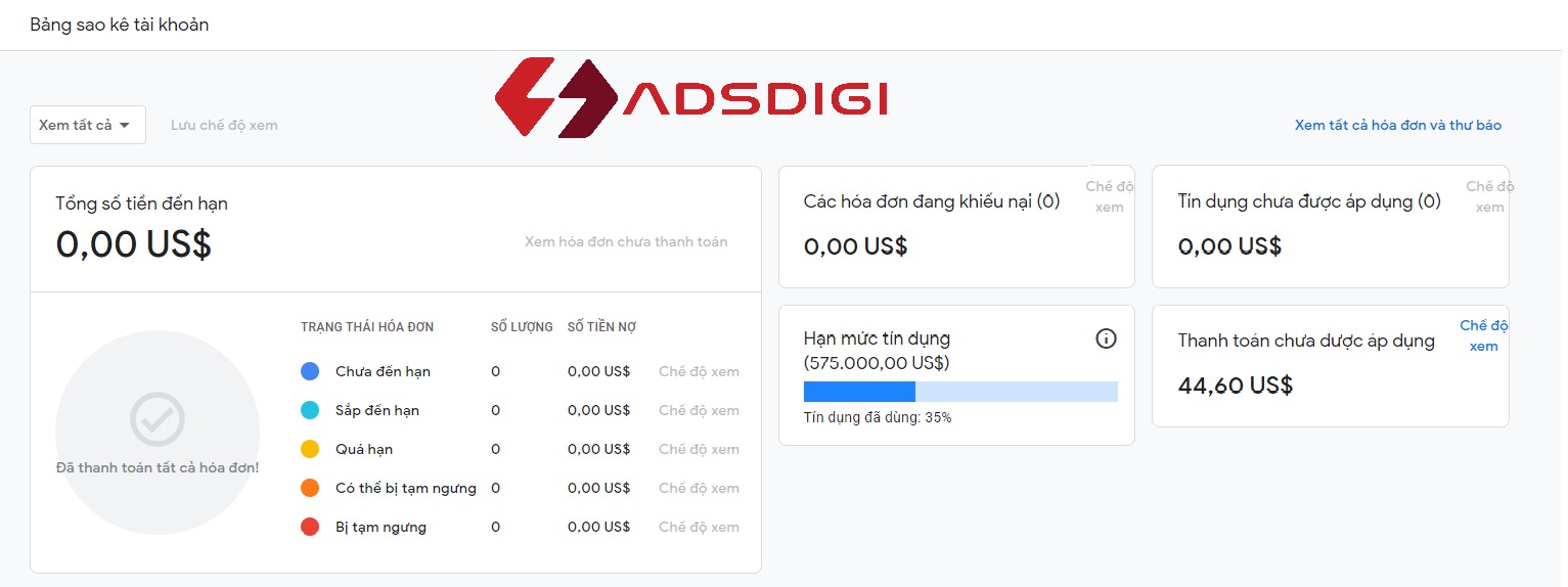 ADSDIGI là một trong những đơn vị cung cấp thuê tài khoản Invoice Google uy tín. Chúng tôi được cấp tài khoản Invoice với hạn mức lớn, lên tới 15 tỷ đồng/tháng. Nhờ đó, công ty có thể hỗ trợ doanh nghiệp triển khai các chiến dịch quảng cáo quy mô lớn. Đồng thời, đảm bảo tính ổn định và tối ưu hiệu quả ngân sách. Ngoài ra, chúng tôi đã xây dựng hệ thống nạp – rút trực tuyến riêng. Nhờ vậy, khách hàng dễ dàng thao tác, quản lý ngân sách hiệu quả.